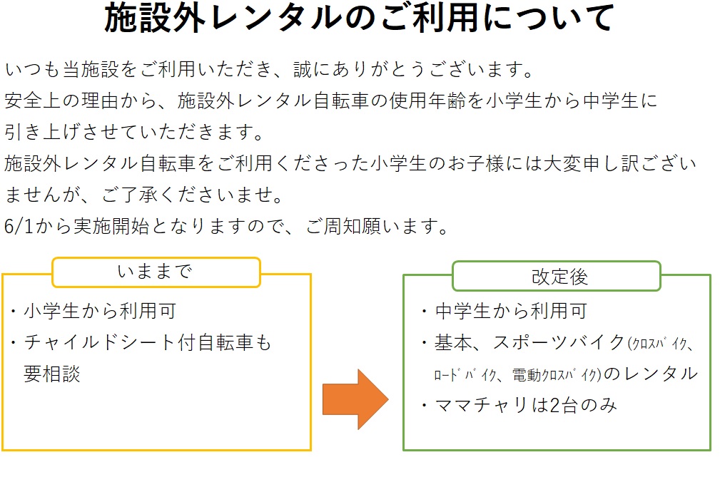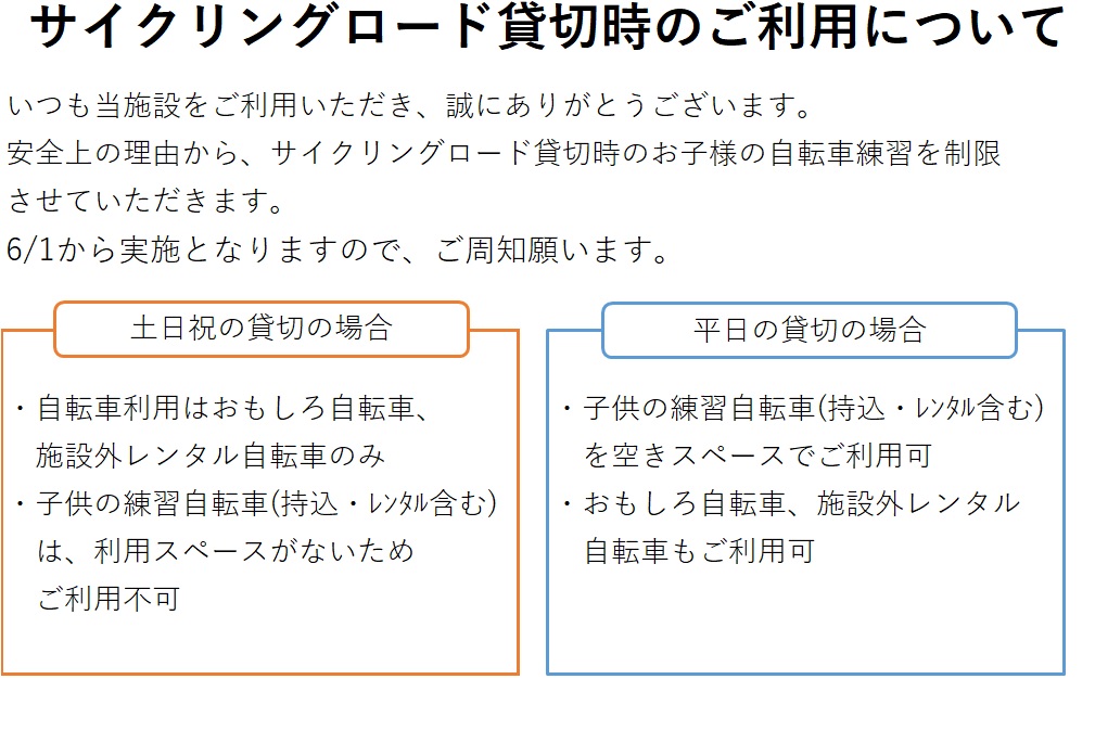 2024年05月13日 屋外施設の利用について一部変更がございます(6/1~ いつも当施設をご利用いただき、誠にありがとうございます。 安全上の理由から、屋外施設の利用について一部変更がございます。 サイクリングロード貸切時のお子様の持ち込み自転車・レンタルについての制限と、施設外レンタルの使用年齢引き上げを6/1から開始します。 皆様には大変ご迷惑をおかけいたしますが、ご周知願います。