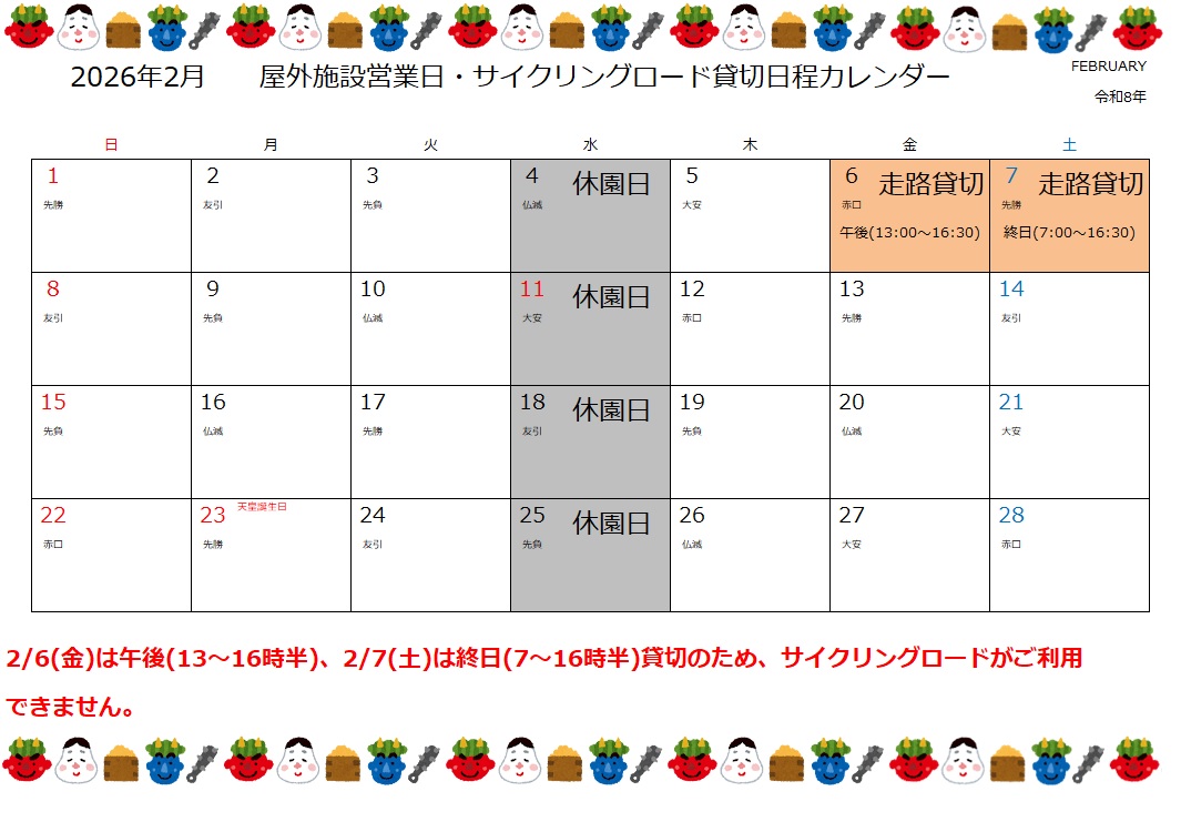 2026年02月01日 2月 屋外施設営業カレンダー いつも名取市サイクルスポーツセンターをご利用頂き、誠にありがとうございます。 2月の屋外施設営業情報をお知らせいたします。 ◆サイクリングロード 貸切日 ・2/6(金) 午後(13:00~16:30) ・2/7(土) 終日(7:00~16:30) 上記の日程は、貸切エリアに限り一般のお客様の利用ができませんのでご注意ください。 たくさんの皆様のご来館をお待ちしております。 名取市サイクルスポーツセンター