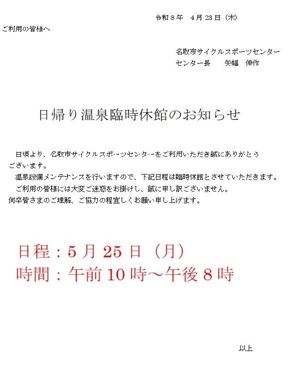 ご利用の皆様へ:5/25(月)日帰り温泉臨時休館となります。