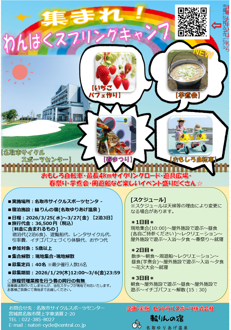 1周4kmのサイクリングロード、おもしろ自転車、夜はみんなで春祭り、2日目は第八喜多丸で太平洋へGo~、お昼は初登場 レストランHACHIが作る芋煮会、夜は花火大会、3日目は屋外施設いっぱい遊んでお昼はレストランHACHIでランチ、最後はイチゴパフェづくりなど楽しさいっぱいの2泊3日宿泊イベントです^○^