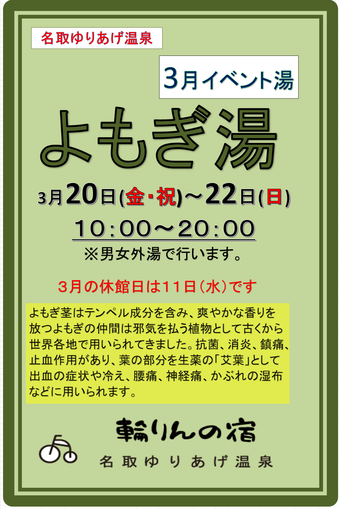 日帰り温泉3月季節湯 よもぎ湯 3/20(金・祝)~22(日)の3日間開催